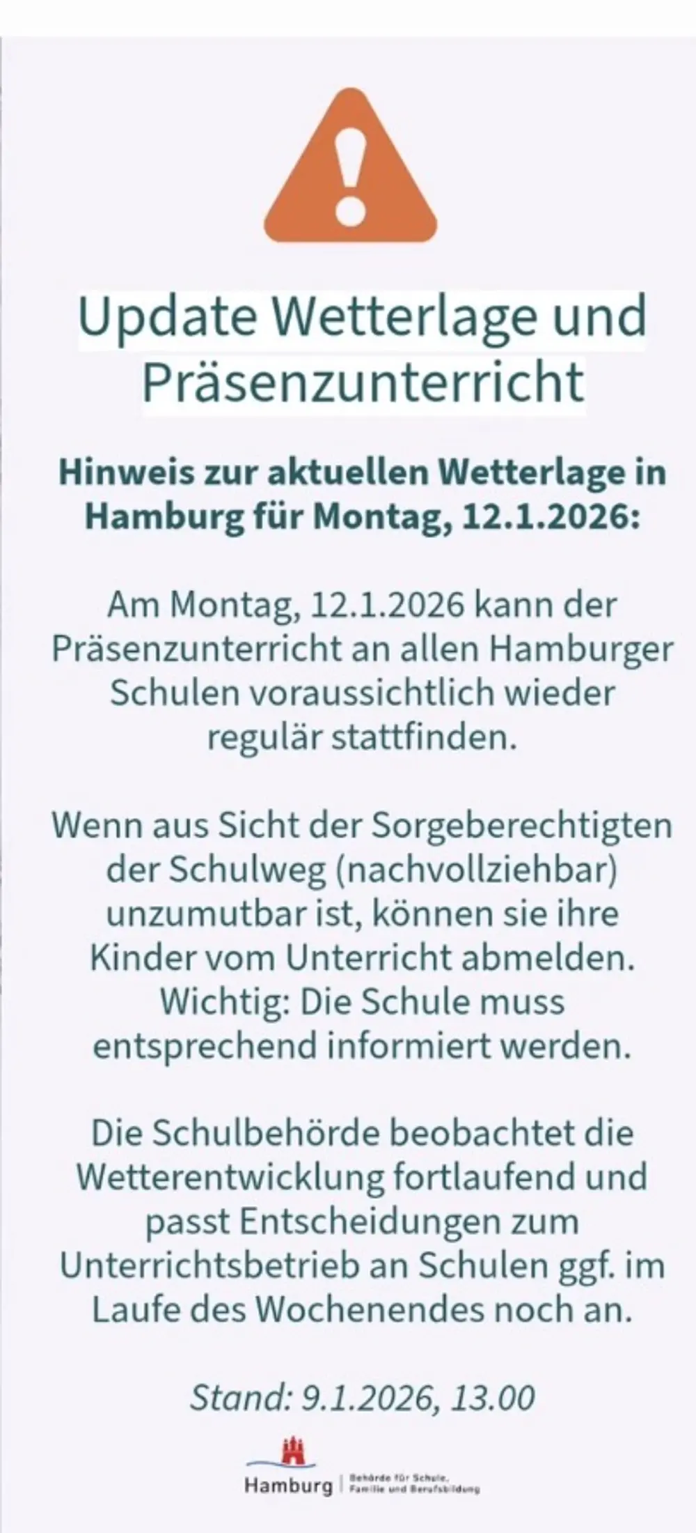 Montag, 12. Januar 2026 voraussichtlich normaler Schulbetrieb