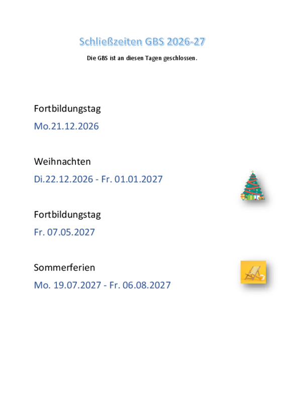 Schließzeiten der GBS bis Sommer 2027